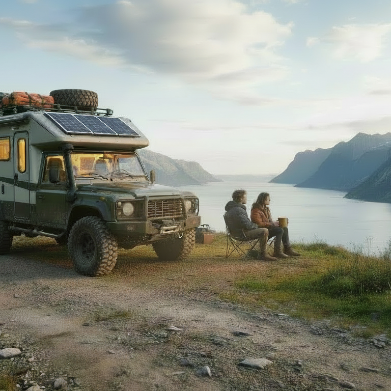 KI-generiert: Abendsonne am Geländewagen mit Aufstelldach
